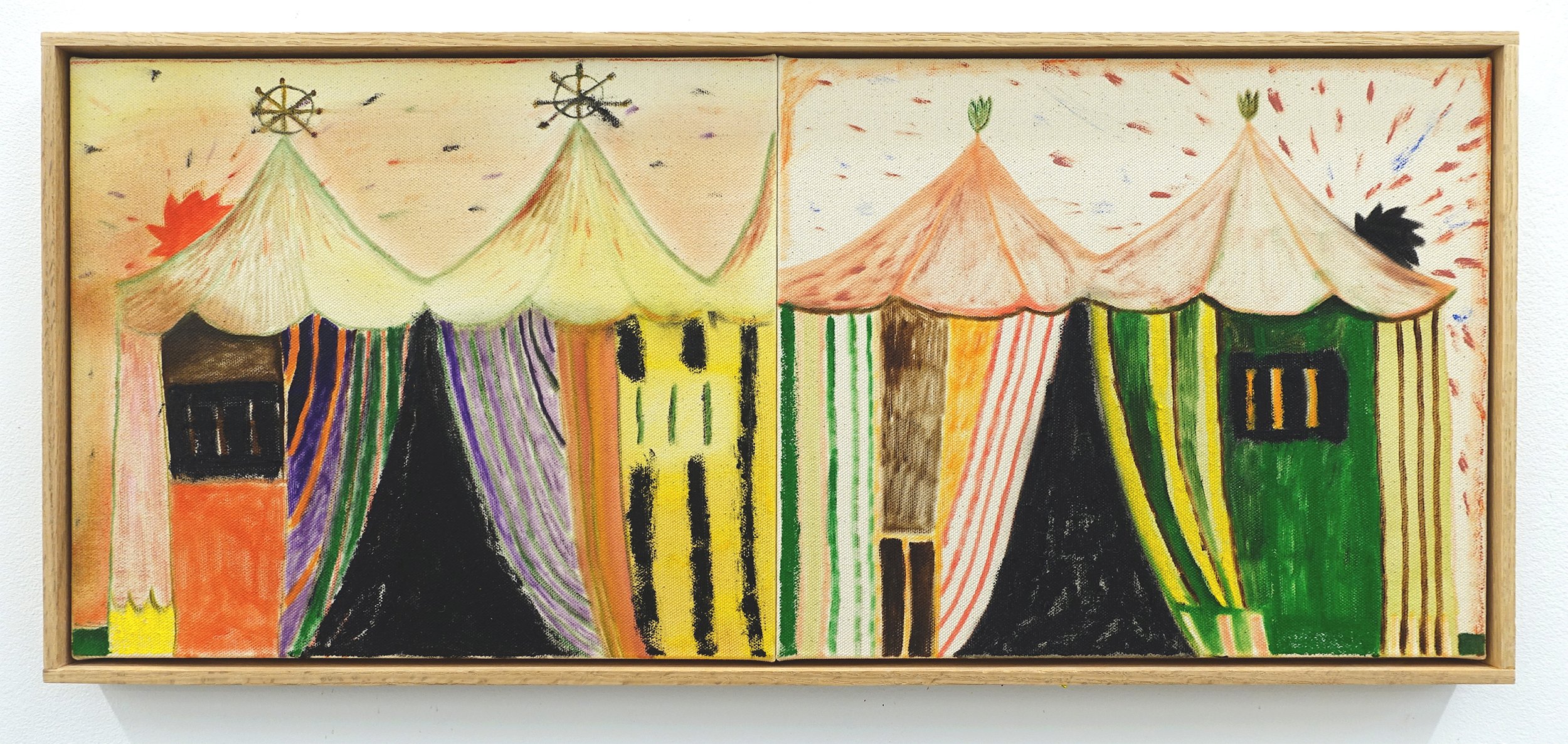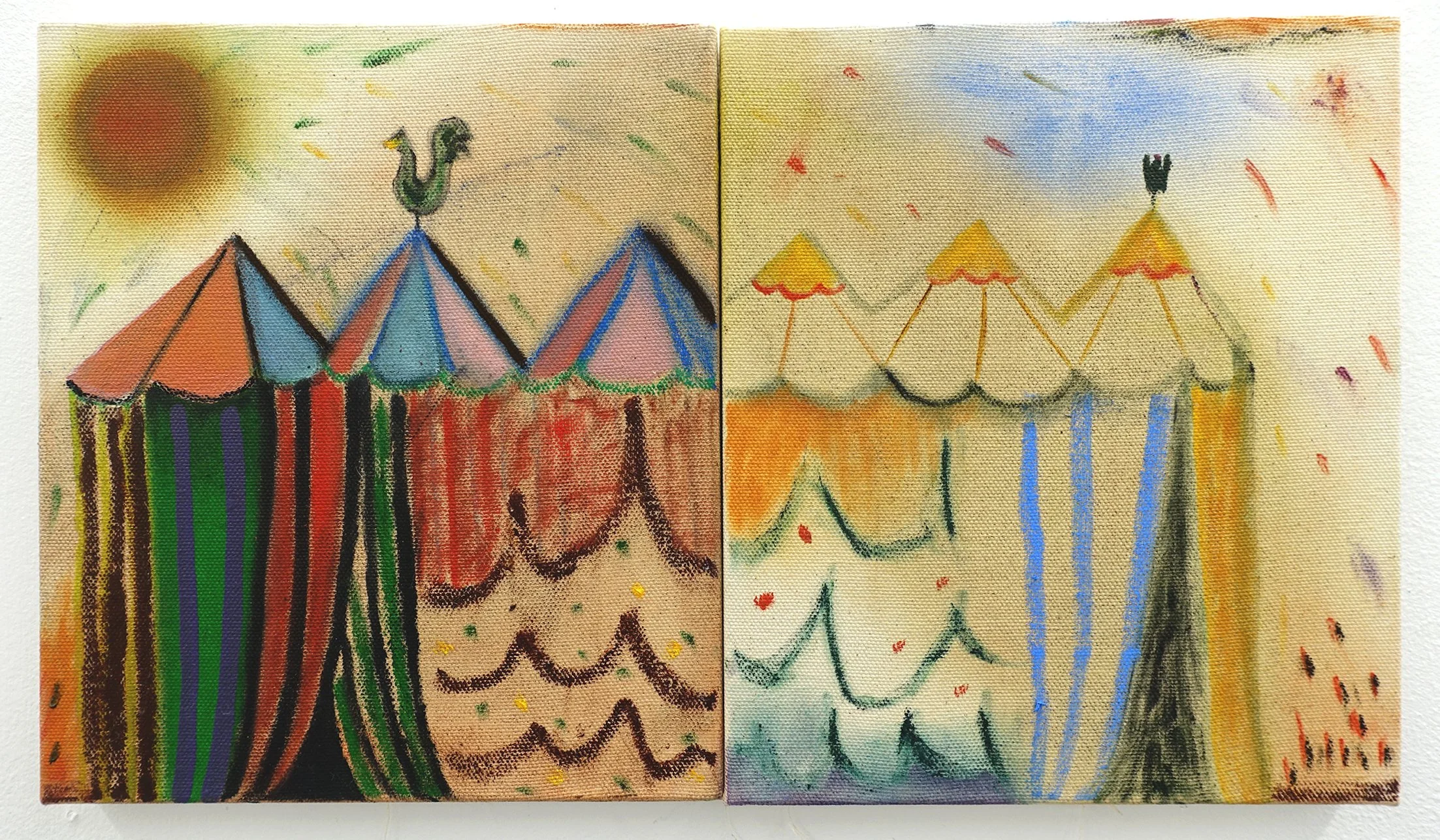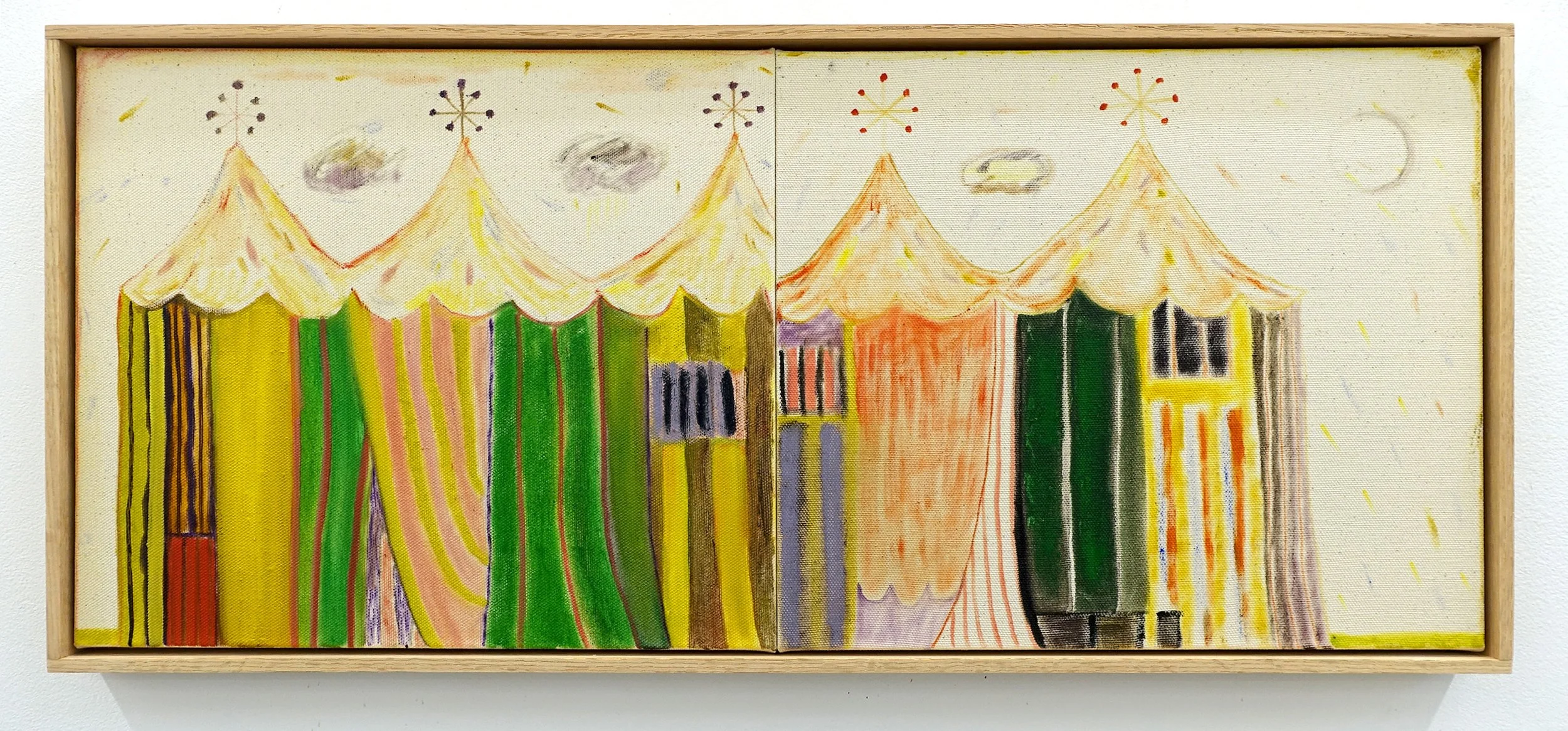 Här är jag. Vem är du? Det är titeln på en av familjepsykologen Jesper Juuls mest kända böcker – en blinkning mot barnet som ser tillbaka på sin vuxna. En uppmaning till ett ömsesidigt, nyfiket möte: här är jag, vem är du? Autentiskt, utan föreskrifter. Samma fråga bär Lisa Lundgrens utställning på Björkholmen Gallery, Här är jag, som följs av en andra presentation av verk på Stallbackens kulturhus med titeln Vem är du?. Tillsammans bildar de ett samtal – mellan platser, bilder och betraktare. I Lisa Lundgrens måleri öppnas portar mot barndomen, men också mot andra tillstånd och världar. Motiven kan vid första anblick framstå som enkla: cirkustält, fåglar, byggnader, upprepningar. Men bakom denna återhållsamma bildvärld finns en förtätning som undviker det naiva. Här finns snarare ett lågmält men ihållande sökande efter något bortom det synliga – en rörelse mot minne, dröm och existentiell närvaro. Lundgren arbetar ofta med tunna lager oljefärg på harlimsförberedd duk, ett material med lång konsthistorisk tradition. Den råa ytan och färgens transparens skapar ett skimmer där bilden långsamt träder fram, nästan som om den redan fanns där och varsamt lockas fram. Bilderna hålls nära ytan och målningarna blir platser att vistas i, snarare än fönster att se igenom. Samtidigt rör sig penseldragen mellan det barnsligt undersökande och det meditativt koncentrerade. Fåglar går, flyr, eller kanske tvekar. Byggnaderna liknar cirkustält – eller tillfälliga hem. Tälten återkommer som motiv i Lundgrens verk, alltid laddade med tvetydighet: de är både skydd och något tillfälligt, både fest och allvar. Som i teatern är allt tillfälligt, en plats på väg till nästa. Man går upp på scenen, deltar, tackar – och går av. Färgerna skiftar mellan svala pasteller och plötsliga utbrott av stark kontrast. Repetitionerna i bildspråket erbjuder inte svar, utan variationer. Varje ny version förskjuter betydelsen en aning, som om samma tanke prövades igen – ett varv till. Upprepningen bidrar till den meditativa känslan, som samsas med en vaksam nyfikenhet: vad händer om vi stannar kvar lite längre? Lundgrens måleri befinner sig tydligt i nuet, men bär spår av ett tidigt barndomsminne – insikten om livets tillfällighet. Det är ett måleri som inte förklarar, utan lyssnar. Som konstnären själv uttrycker det: För mig är det enkla ofta det svåraste. Men när det blir rätt händer något i bilden som stannar kvar. Här är jag. Vem är du?