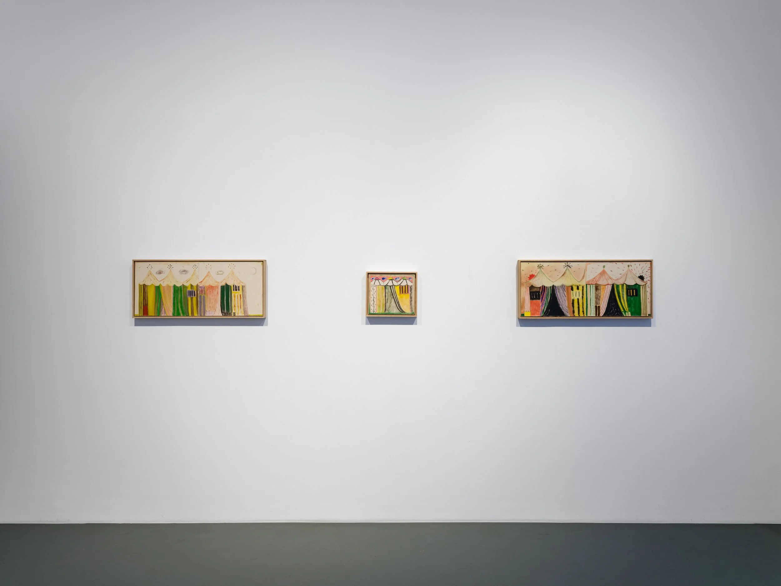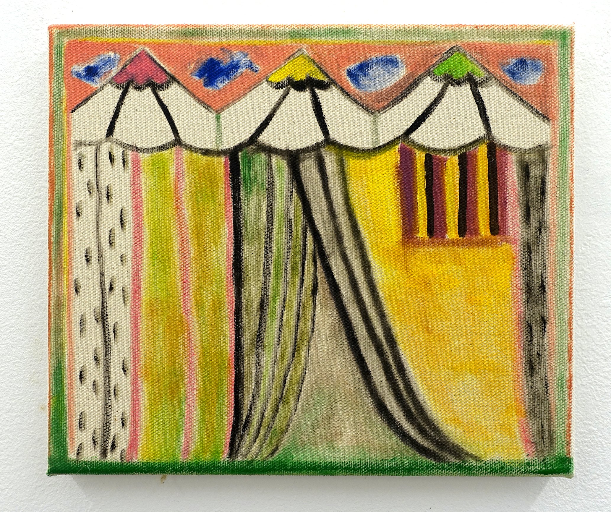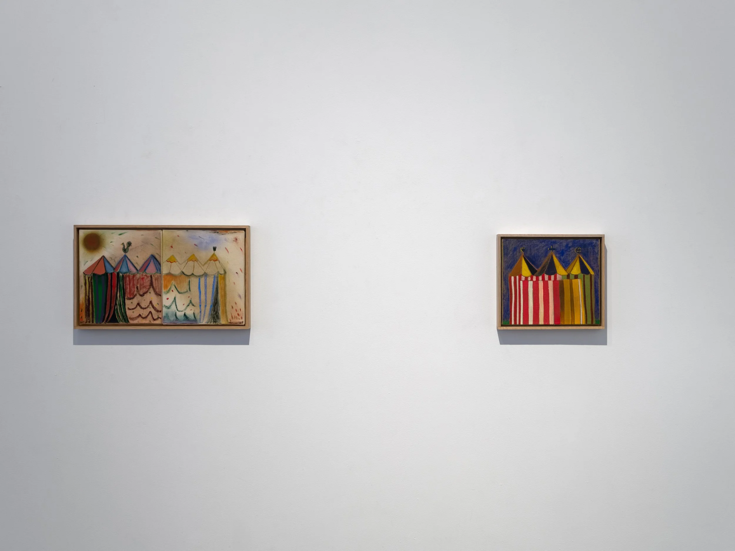 Här är jag. Vem är du? Det är titeln på en av familjepsykologen Jesper Juuls mest kända böcker – en blinkning mot barnet som ser tillbaka på sin vuxna. En uppmaning till ett ömsesidigt, nyfiket möte: här är jag, vem är du? Autentiskt, utan föreskrifter. Samma fråga bär Lisa Lundgrens utställning på Björkholmen Gallery, Här är jag, som följs av en andra presentation av verk på Stallbackens kulturhus med titeln Vem är du?. Tillsammans bildar de ett samtal – mellan platser, bilder och betraktare. I Lisa Lundgrens måleri öppnas portar mot barndomen, men också mot andra tillstånd och världar. Motiven kan vid första anblick framstå som enkla: cirkustält, fåglar, byggnader, upprepningar. Men bakom denna återhållsamma bildvärld finns en förtätning som undviker det naiva. Här finns snarare ett lågmält men ihållande sökande efter något bortom det synliga – en rörelse mot minne, dröm och existentiell närvaro. Lundgren arbetar ofta med tunna lager oljefärg på harlimsförberedd duk, ett material med lång konsthistorisk tradition. Den råa ytan och färgens transparens skapar ett skimmer där bilden långsamt träder fram, nästan som om den redan fanns där och varsamt lockas fram. Bilderna hålls nära ytan och målningarna blir platser att vistas i, snarare än fönster att se igenom. Samtidigt rör sig penseldragen mellan det barnsligt undersökande och det meditativt koncentrerade. Fåglar går, flyr, eller kanske tvekar. Byggnaderna liknar cirkustält – eller tillfälliga hem. Tälten återkommer som motiv i Lundgrens verk, alltid laddade med tvetydighet: de är både skydd och något tillfälligt, både fest och allvar. Som i teatern är allt tillfälligt, en plats på väg till nästa. Man går upp på scenen, deltar, tackar – och går av. Färgerna skiftar mellan svala pasteller och plötsliga utbrott av stark kontrast. Repetitionerna i bildspråket erbjuder inte svar, utan variationer. Varje ny version förskjuter betydelsen en aning, som om samma tanke prövades igen – ett varv till. Upprepningen bidrar till den meditativa känslan, som samsas med en vaksam nyfikenhet: vad händer om vi stannar kvar lite längre? Lundgrens måleri befinner sig tydligt i nuet, men bär spår av ett tidigt barndomsminne – insikten om livets tillfällighet. Det är ett måleri som inte förklarar, utan lyssnar. Som konstnären själv uttrycker det: För mig är det enkla ofta det svåraste. Men när det blir rätt händer något i bilden som stannar kvar. Här är jag. Vem är du?